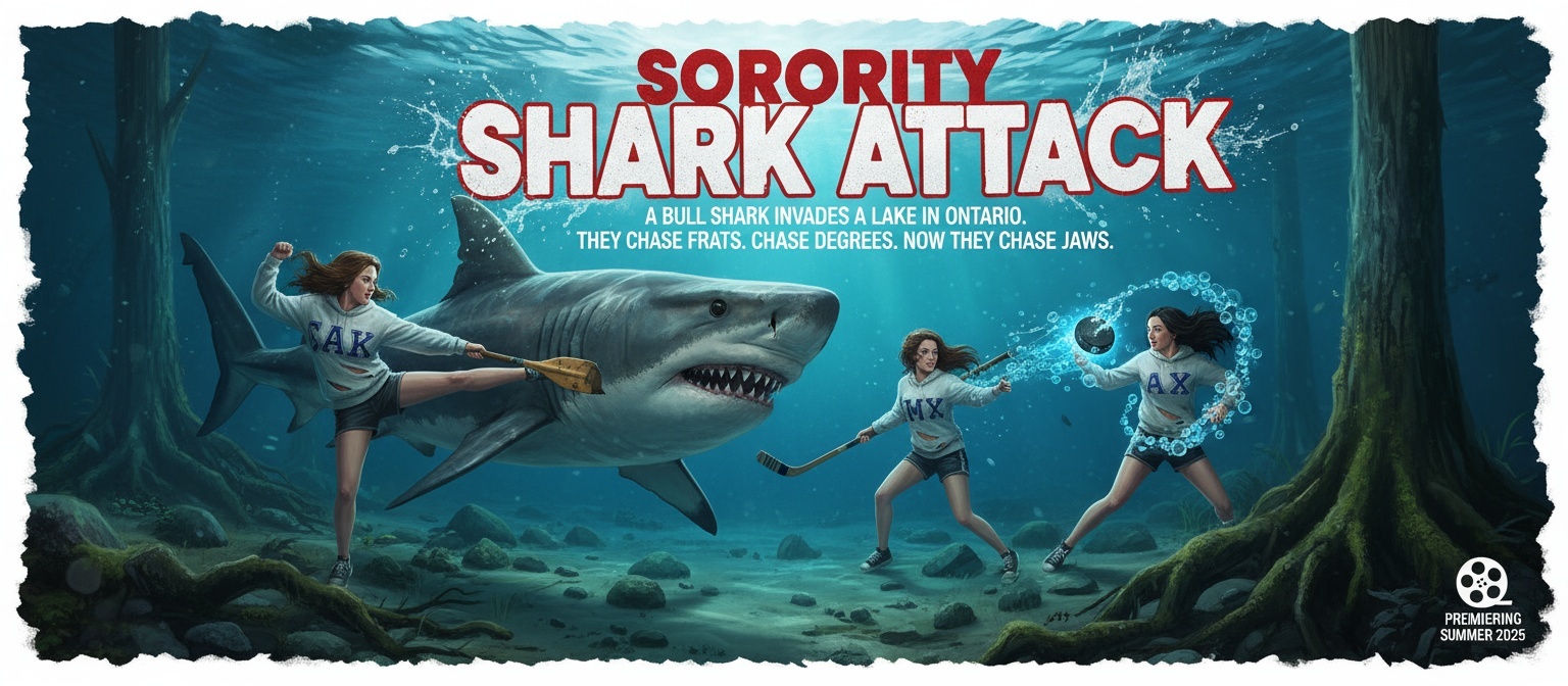 Story Three sorority sisters head to a lakeside cabin where unsettling ripples, a gruesome death, and a lock-side fin reveal a bull shark prowling an Ontario waterway. As a principled Police constable battles a grandstanding mayor to close the lake, Chloe discovers a notebook tying the predator to covert experiments. When friends are stranded on a nearby island and public attacks escalate, the group aligns with a weary medical examiner and Chloe’s professor father to devise a high-risk countermeasure. A sardonic young WaveRunner rider and small-town allies join the effort, culminating in a desperate chase that tests leadership, loyalty, and nerve, while hinting the threat may not be contained.